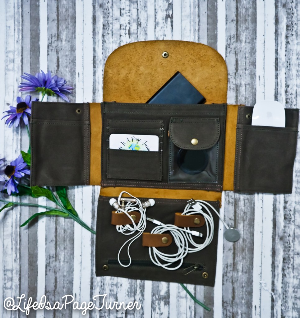 The Gadget Clutch, GC, can be carried by itself as a clutch, for a night out or an afternoon walking around, but its main purpose is to organize your items. It is best for your extra cords, hard drives, and other items. I don’t really like the loop aspect of the cords, it doesn’t keep them in well when moving it around.
