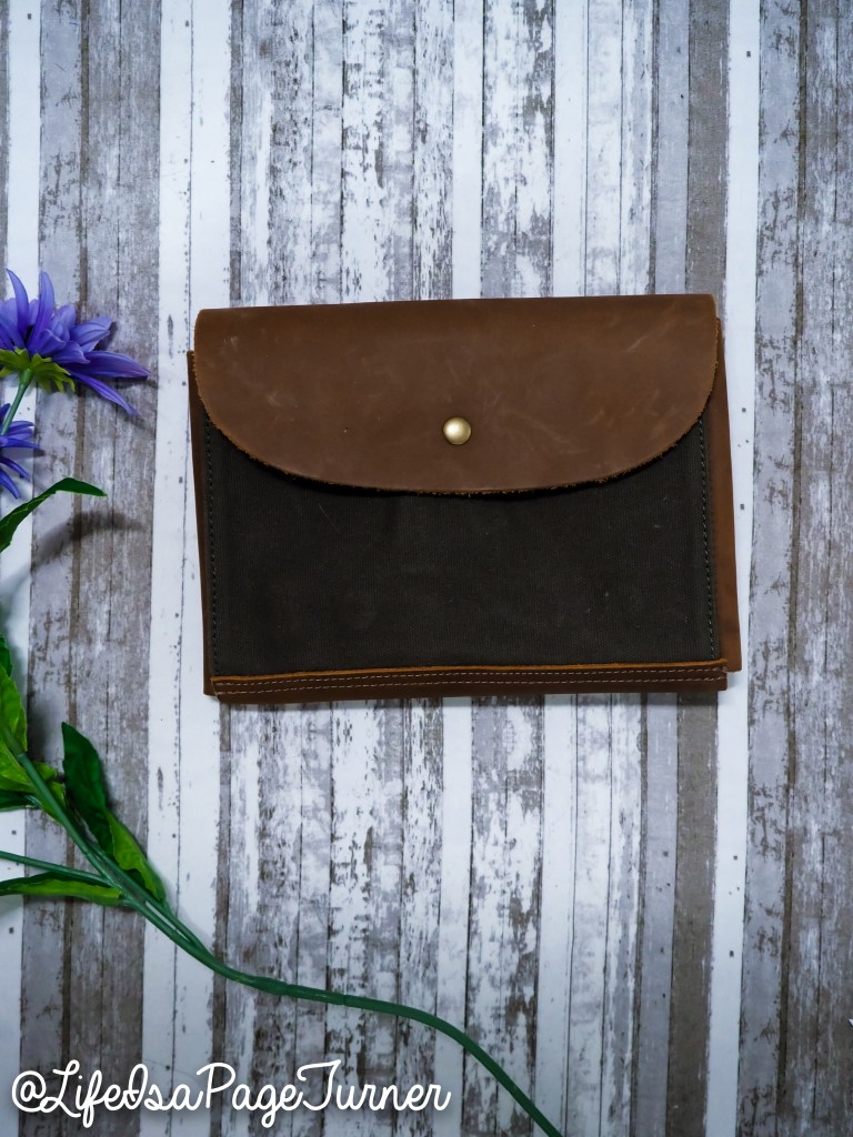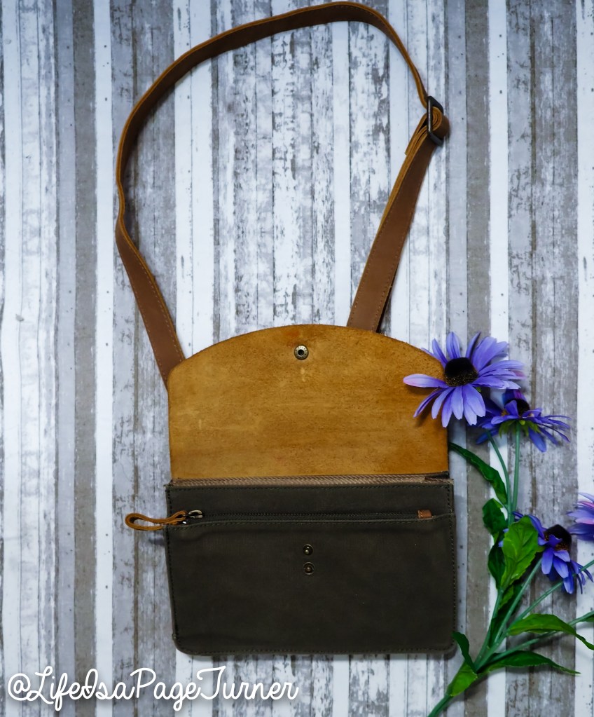 It is made with leather and canvas just like the Gadget Clutch, but it doesn’t open all the way, so that you can keep whatever contents inside of the bag. It just has the top flap and a zipper with an outside pocket that you can slide small thing in as well.